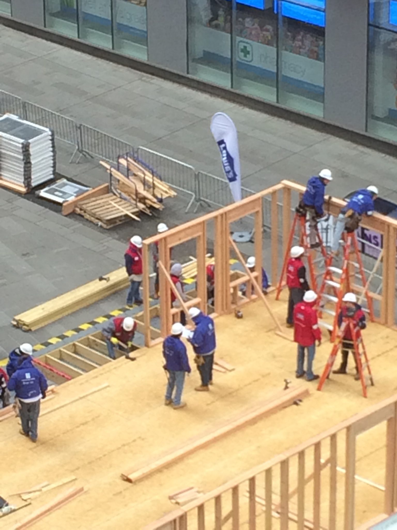 I got off the train this morning and right in front of me was the beginnings of a wood frame for a house. Â Habitat for Humanity and Lowe’s hardware store teamed up and spent the day erecting a house in front of everyone. Â It was quite the sight to see. Â I was hoping they would finish in one day but apparently this will be a two day undertaking.