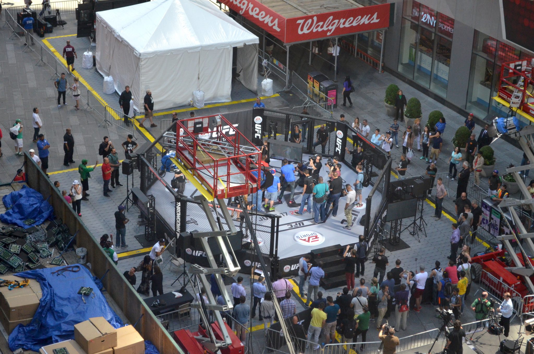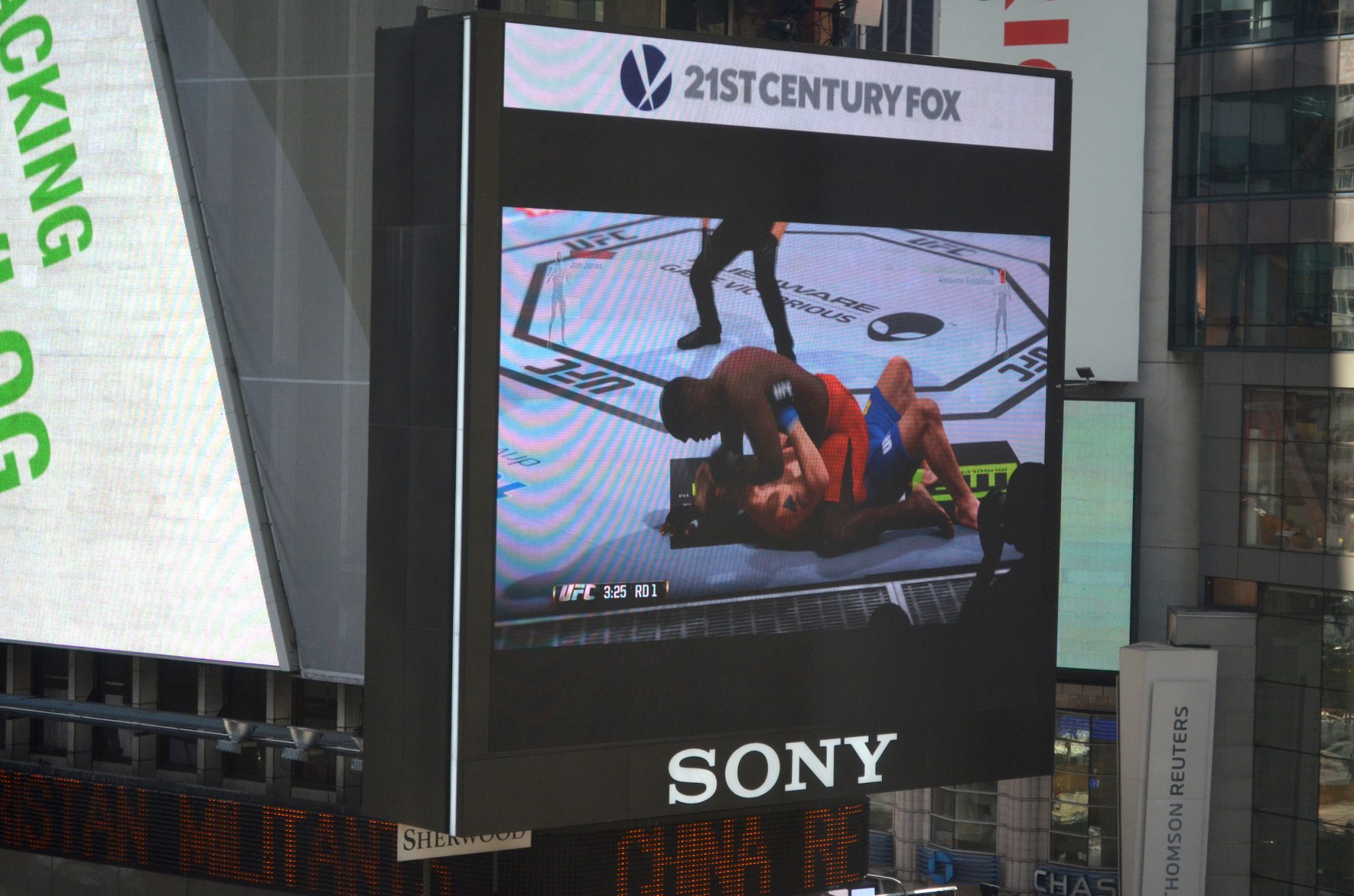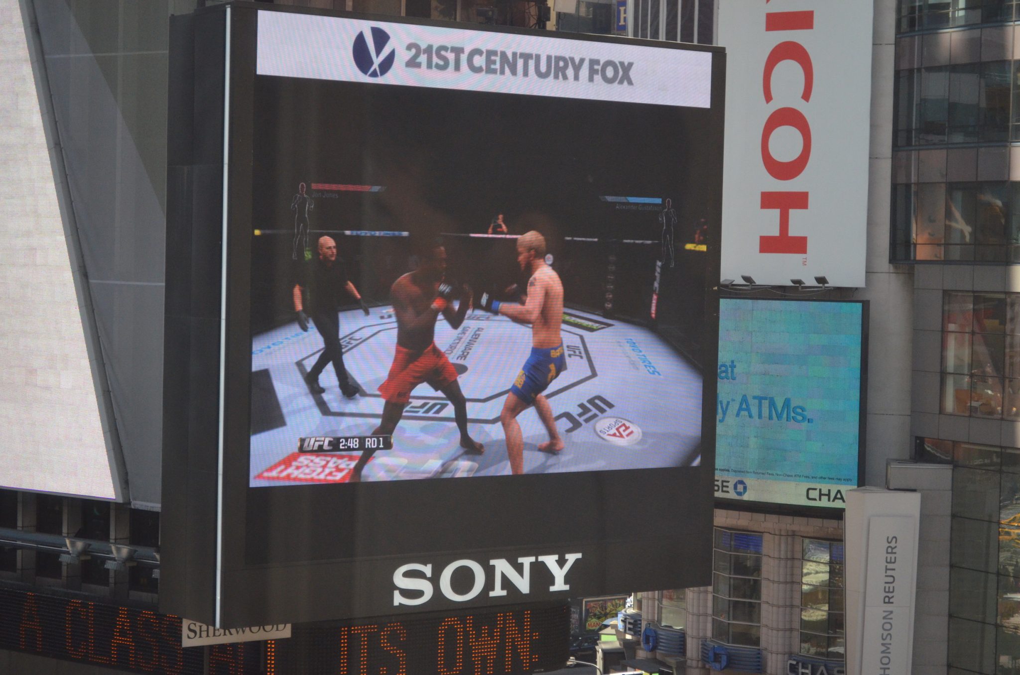 What do you get when you take The Octagon from UFC, place it in one of the most recognizable areas around the world, add two UFC pros in Jon Jones and Carlos Condit and then finish it off with 50 foot tall tv screens? One hell of a marketing campaign, that is what you get. EA Sports did just that this week with a battle royale of sorts. They set-up The Octagon and let the two pros virtually duke it out over the big screens which was actually a lot of fun to watch.
