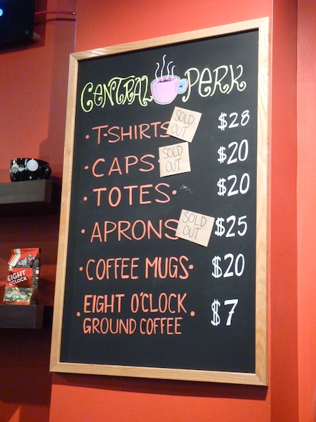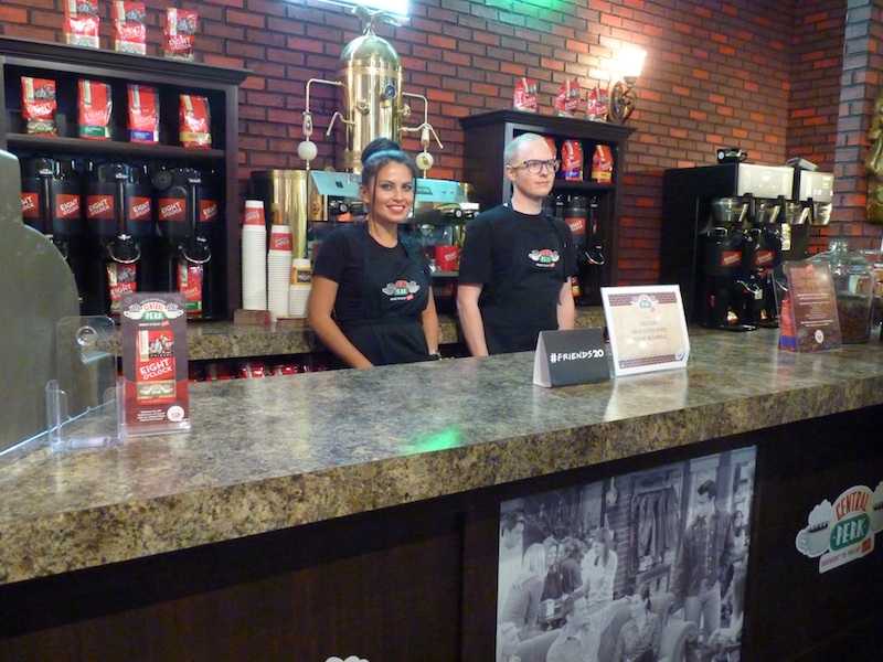 Part coffee shop (the coffee is free every day, and a sponsor of the pop-up, Eight O’Clock Coffee, has even created a limited edition Central Perk Roast that you can buy to take home), part museum (some of the cast’s outfits; signed pilot and finale scripts; and of course, “smelly cat” memorabilia), and part photo booth (you can actually sit on the couch and get your photo taken), the pop has also been hosting special events, including a recent appearance by the actor who played Gunther (James Michael Tyler). In the back, a large screen plays episodes of the show.